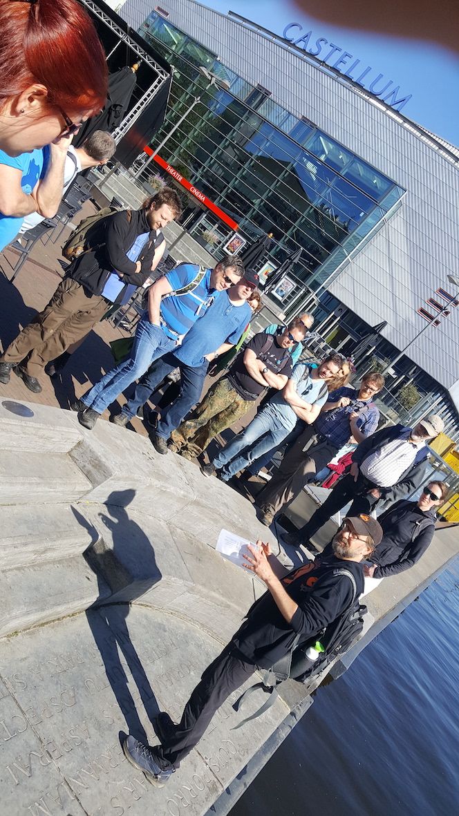 Begeleid door de geweldige gids van Bierwandeltochten vertrekken we om 10 uur vanuit Station Alphen aan de Rijn. Speciaal in het kader van de Romeinenweek is de Bierwandeltocht omgedoopt tot de echte Romeinse Bierveldtocht. In castellum Albanianae (Alphen aan de Rijn) horen we over het Romeinse verleden van de stad en haar belangrijke rol in de verdediging van de limes. Dit verleden wordt onder andere herinnerd door Romeinse keizerlijke munten – zoals die van Caligula – in de vorm van straattegels, iets wat je op de fiets gauw zou missen. Ook is er aan de kade van de Rijn een prachtige moderne inscriptie te vinden van een passage uit Tacitus, een Romeins historicus uit de 1e eeuw na Christus. Hij beschrijft Germanië als een gebied met woeste grond, ruw klimaat en een somber leven.