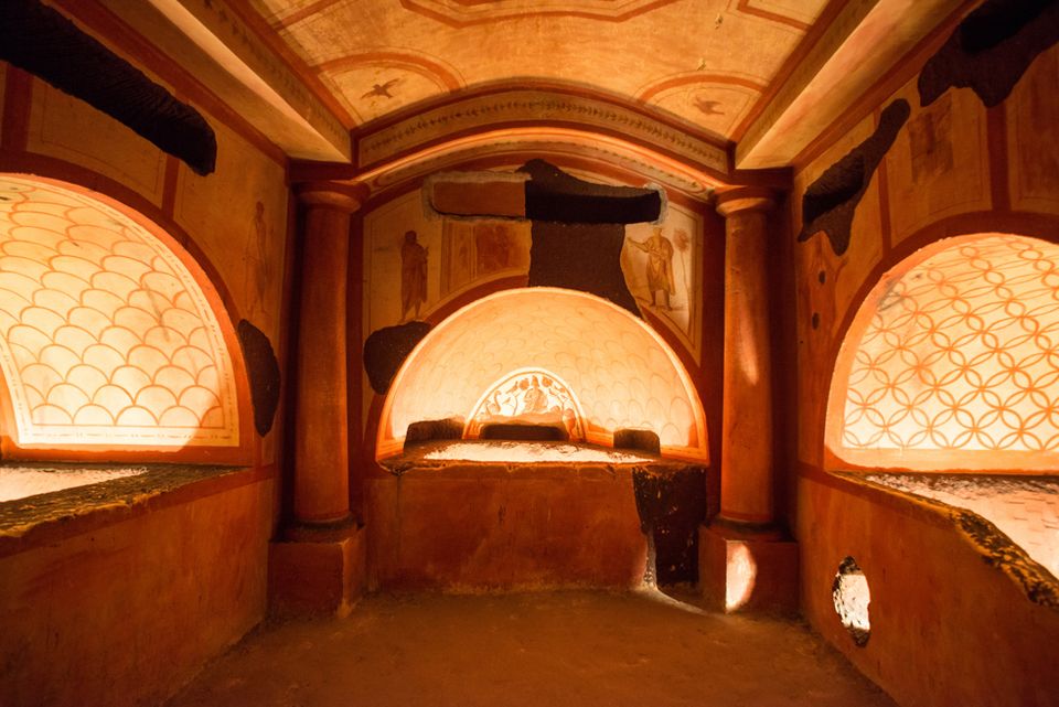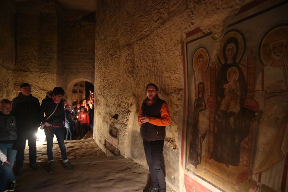 Door Dina Bemelmans - Gewapend met een kaars dalen we af in de Romeinse Katakomben van Valkenburg. We moeten dicht bij elkaar blijven en mogen de gids niet uit het oog verliezen. Het is namelijk gemakkelijk om in dit duistere gangenstelsel te verdwalen. De voormalige mergelgroeve is aan het begin van de twintigste eeuw omgetoverd tot een replica van de mooiste en interessantste catacomben uit het oude Rome. En met ‘replica’ wordt hier echt een exacte kopie bedoeld. De witte mergelsteen van Zuid-Limburg is vulkanisch zwart geverfd, de algenvlekken zijn overgenomen in de wandschilderingen en de sporen van grafrovers zijn in de graven uitgehouwen.