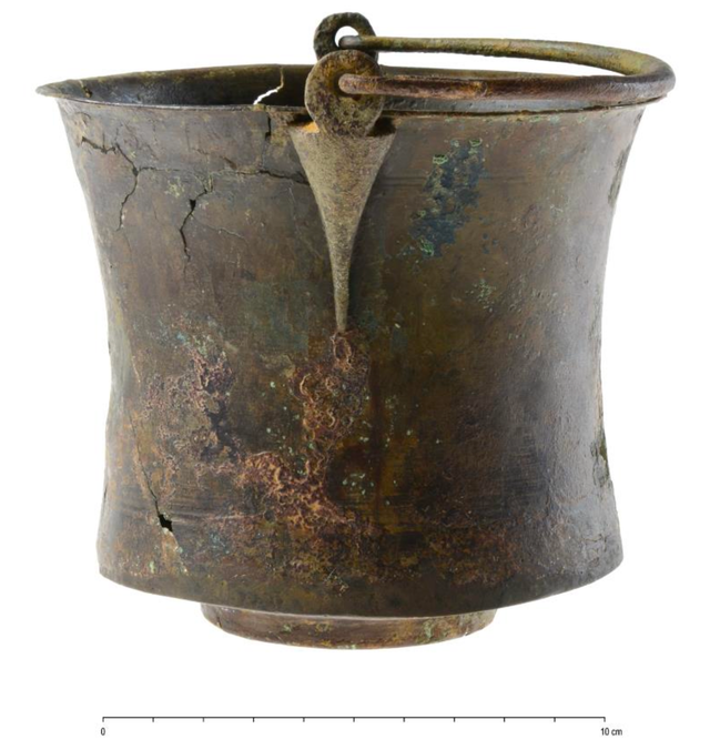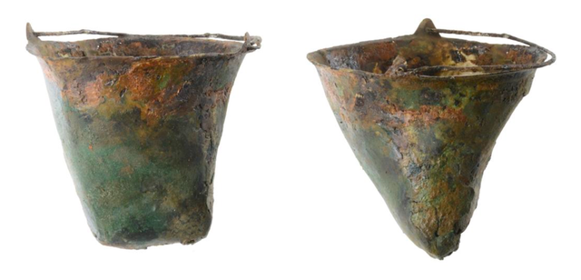 Het emmertje is 13 cm hoog en heeft een diameter van ruim 12 cm. Het is gemaakt uit een enkel stuk koper en waarschijnlijk gebruikt voor het mengen van wijn. Tot grote verbazing van de archeologen zat in het emmertje nog een tweede, nog veel kleiner exemplaar verborgen. Deze had de vorm van een hedendaagse koffiefilter met een grootste diameter van 8 cm en een hoogte van amper 7 cm. Ongetwijfeld maakte dit voorwerp ook deel uit van het drinkservies, maar de functie ervan is onbekend. Onderzoek naar het koper wijst erop dat dit waarschijnlijk uit Spanje kwam.