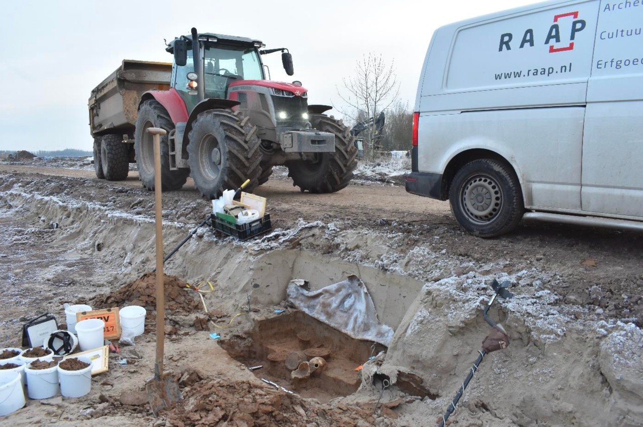 Het crematiegraf met de emmer lag direct onder het gronddoek en de ophoging voor de tijdelijke bouwweg (RAAP).