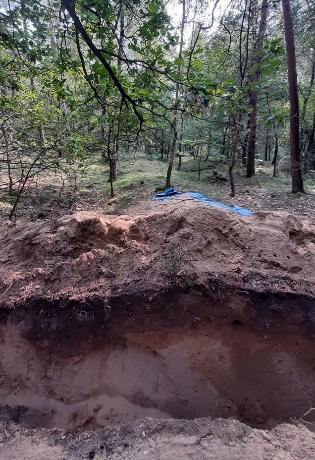Dwarsdoorsnede door de aarden wal, die duidelijk zichtbaar naar achteren doorloopt in het bos (Wouter Hinrichs).