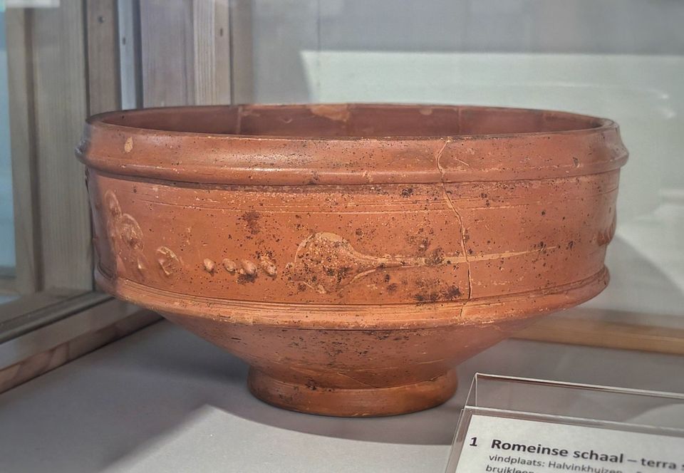 Terra Sigillata betekent ‘gestempelde aarde’ in het latijn, verwijzend naar de veelvoorkomende ingedrukte decoraties die vaak op de rood tot oranje borden, kommen en bakjes voorkomen. In tegenstelling tot wat de naam suggereert zijn de hart- en bloemvormige cirkellijnen niet in de kom gestempeld, maar opgelegd met dunne draden van klei. Deze versiering noemen we barbotine. De kom uit Putten is een latere vorm van Terra Sigillata aardewerk en is waarschijnlijk in de 3e eeuw na christus gemaakt in één van de vele pottenbakkerswerkplaatsen in het westen van Duitsland.
