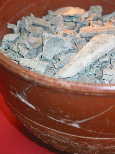 Romeinse terra sigillata kom, gevuld met crematieresten en gebruikt als urn (Archeologisch Centrum Gemeente Amersfoort)
