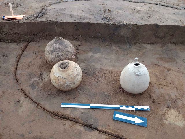 Vrijgelegde kruiken van aardewerk uit een van de graven (RAAP).