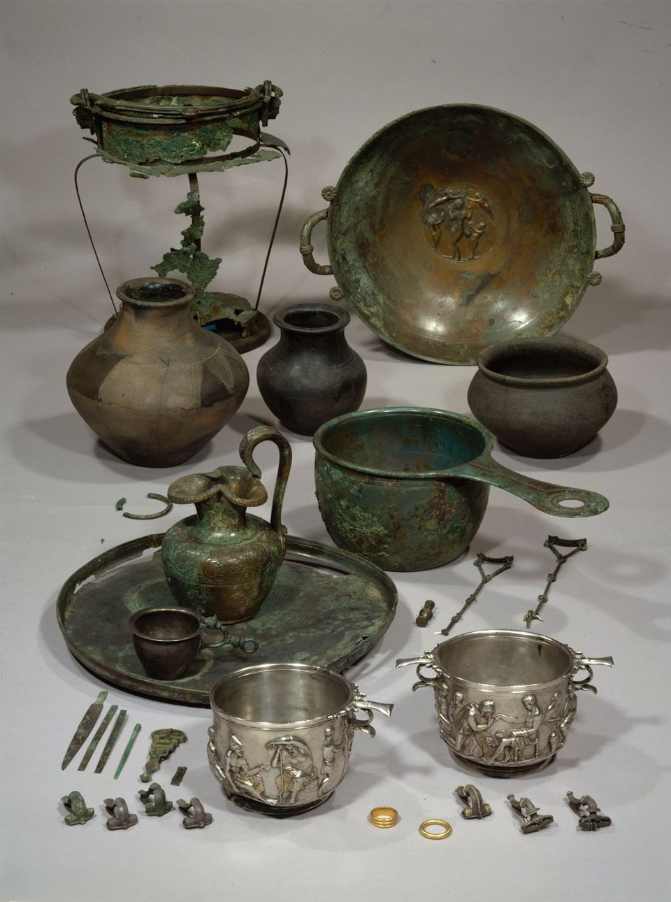 Afbeelding: Hoogwaardige bronzen, zilveren en gouden Romeinse voorwerpen uit het vorstengraf op het eiland van Hoby (Denemarken). De overleden magnaat was waarschijnlijk een officier van een hulptroepeneenheid in het Romeinse leger in de eerste helft van de eerste eeuw n.Chr. © Lennart Larsen, National Museum of Kopenhagen, Denmark.