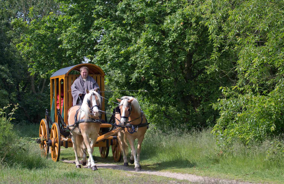 Reizen deed je te voet of te paard, sommigen hadden een kar of wagen. De reis duurde lang en het comfort was matig, want strak asfalt kende men nog niet. Maar ook daar wisten de Romeinen een oplossing voor: een reiswagen met een bak die aan vier riem- houders werd opgehangen door middel van leren banden. Op deze wijze ‘zweeft’ het bovenstel boven de wielen.