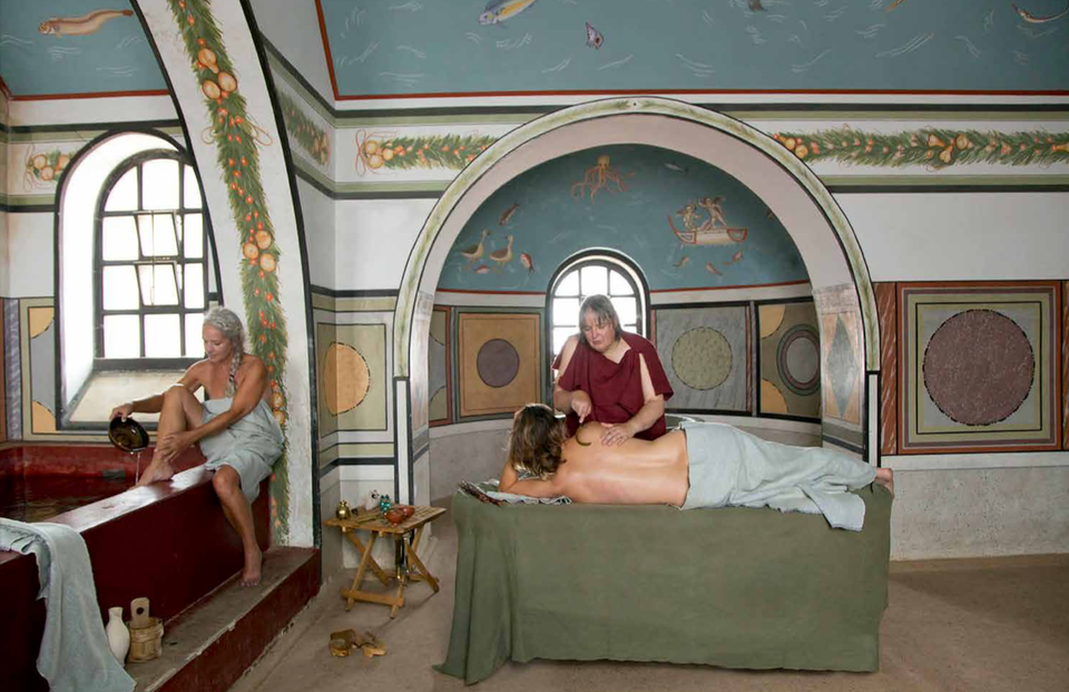 Masseurs (en masseuses) vinden we ook terug in openbare badgebouwen, de thermen. Leden van de middenklasse gingen er graag heen om te relaxen. Het was een sociale ontmoetingsplaats waar je de laatste nieuwtjes hoorde en actief aan sport kon doen. Een beetje te vergelijken met een hedendaagse sauna, maar beter nog met een Turks badhuis (hamam), die rechtstreeks afstamt van het Romeinse bad.