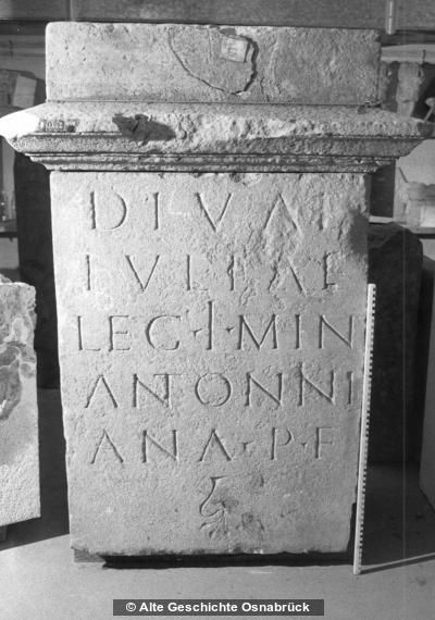Door Liesbeth Claes - Een korte inscriptie op een sokkel meldt ons dat de legionairs van het eerste legioen Minervia Antoniniana Pia Fidelis, gelegerd te Bonn, een standbeeld aan diva Julia opgedragen hebben. Het standbeeld zelf is verloren gegaan. Deze diva Julia is Julia Domna, echtgenote van keizer Septimius Severus. Na haar zelfmoord werd ze door haar neef, de beruchte keizer Elagabalus, vergoddelijkt. Julia is de enige keizerin voor wie er zo’n ere-inscriptie aan de noordelijke grens bekend is. Maar waarom waren de soldaten in onze streken zo dol op haar?
